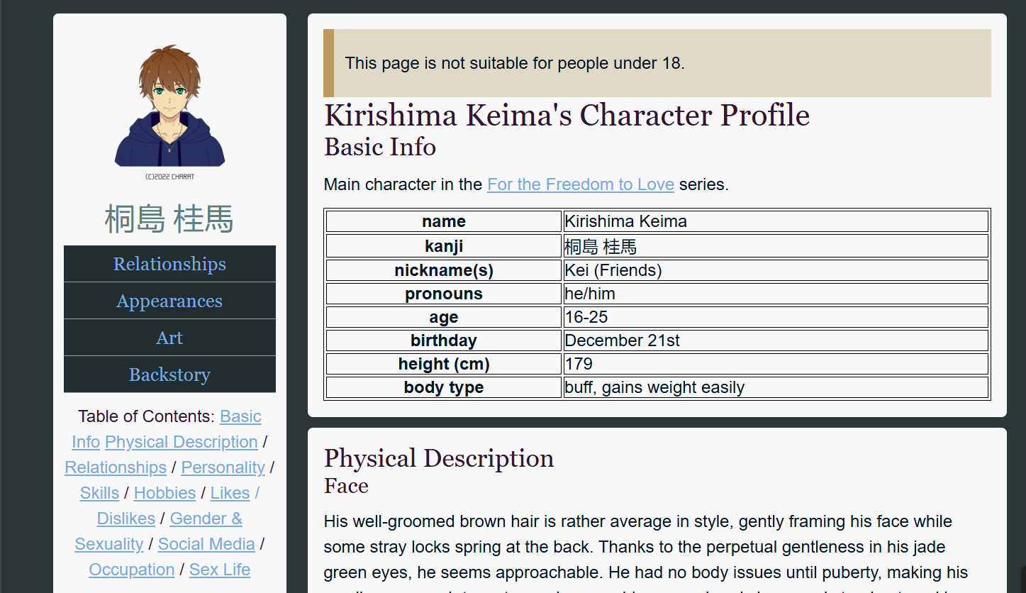 The draft of Kei's profile has been sitting in my Obsidian vault for a couple of years now. I attempted to write a novel (For the Freedom to Love) but have chosen to focus on smutty one shots for now haha.